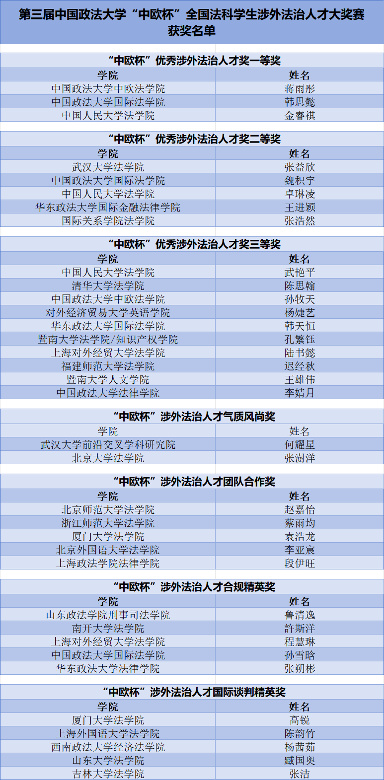 经过激烈角逐,最终来自全国28所法学院系的35名同学脱颖而出。复赛共评选出:“中欧杯”优秀涉外法治人才一等奖3名、二等奖5名、三等奖10名,“涉外法治人才气质风尚奖”2名,“涉外法治人才团队合作奖”5名,“涉外法治人才合规精英奖”5名,“涉外法治人才国际谈判精英奖”5名。