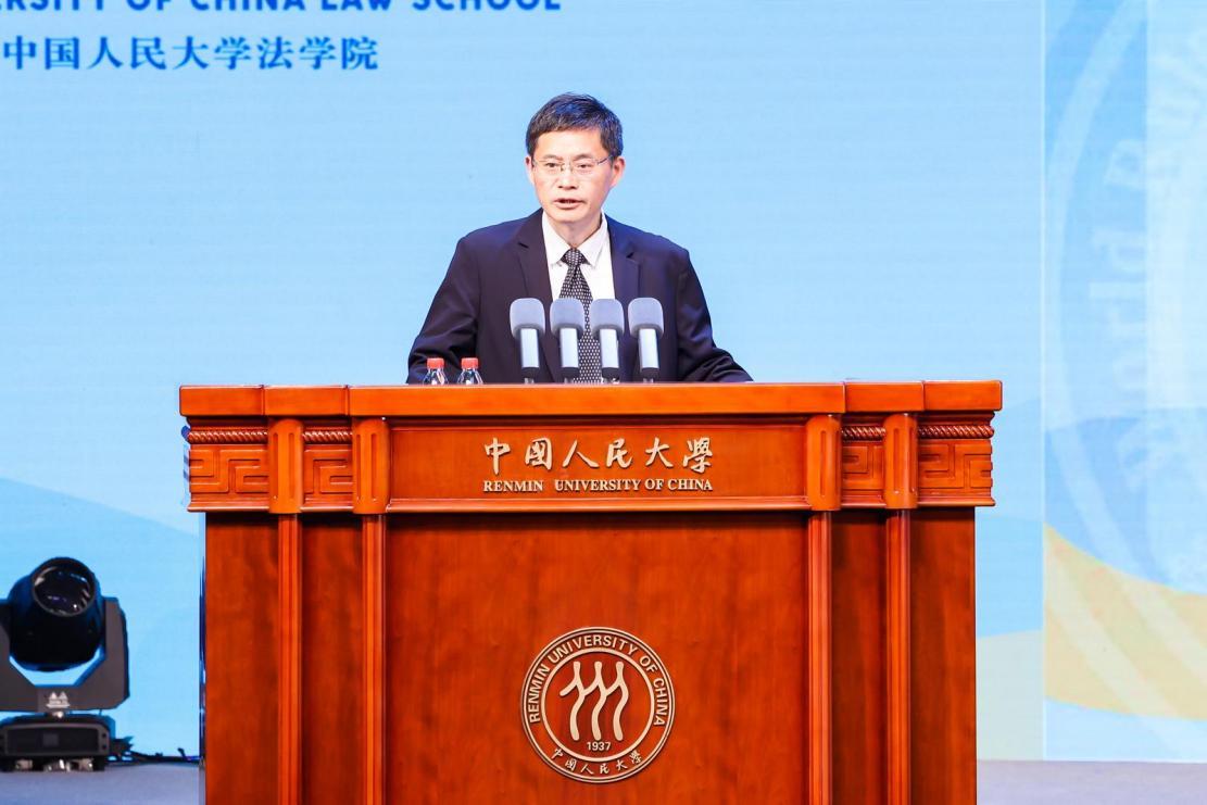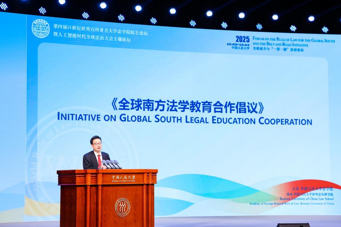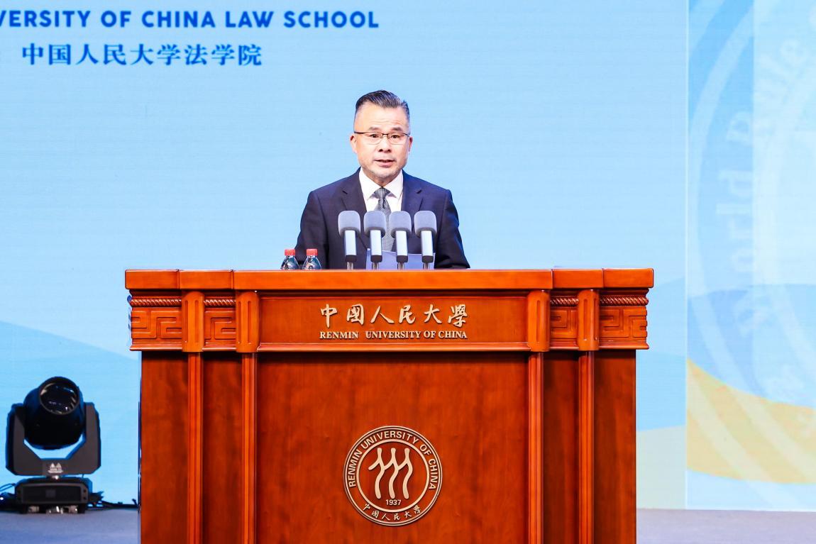 图为中国人民大学法学院院长杨东在论坛主会场开幕式上发布《全球南方法学教育合作倡议》。