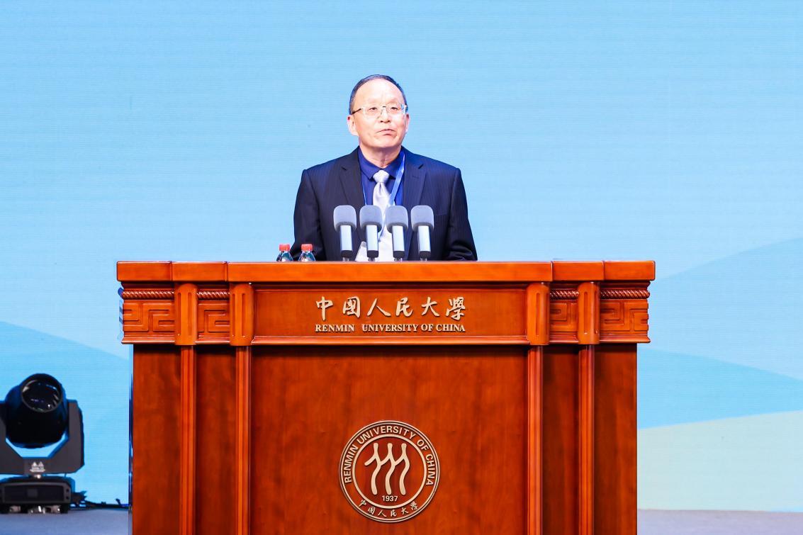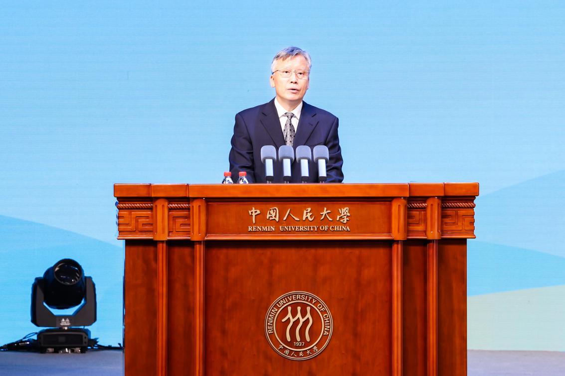 图为中国人民大学副校长郑新业在论坛主会场开幕式上致辞。