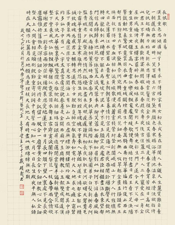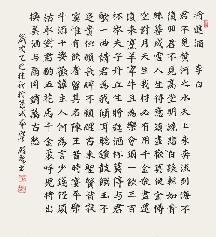 罗殿龙立足广西地域和民族文化,积极推动“八桂书风”在新时代的传承与发展,始终秉持“以笔修身,以墨润心”的高洁志向,在书法艺术之路上不断求索,力求精进。其作品结体端庄匀称,章法疏朗有致,无刻意雕琢之痕,有自然天成之态;笔锋的刚劲,映其处事之坚毅;线条的温润,显其为人之谦和;结体的规整,藏其履职之严谨。这种“书为心画”的融合,让临帖不再是单纯的技艺复刻,而是个人修为与文化素养的直观呈现,使每一幅作品都兼具艺术价值与精神内涵——观之既能感受楷法的正脉之美,更能体悟创作者的人格魅力。