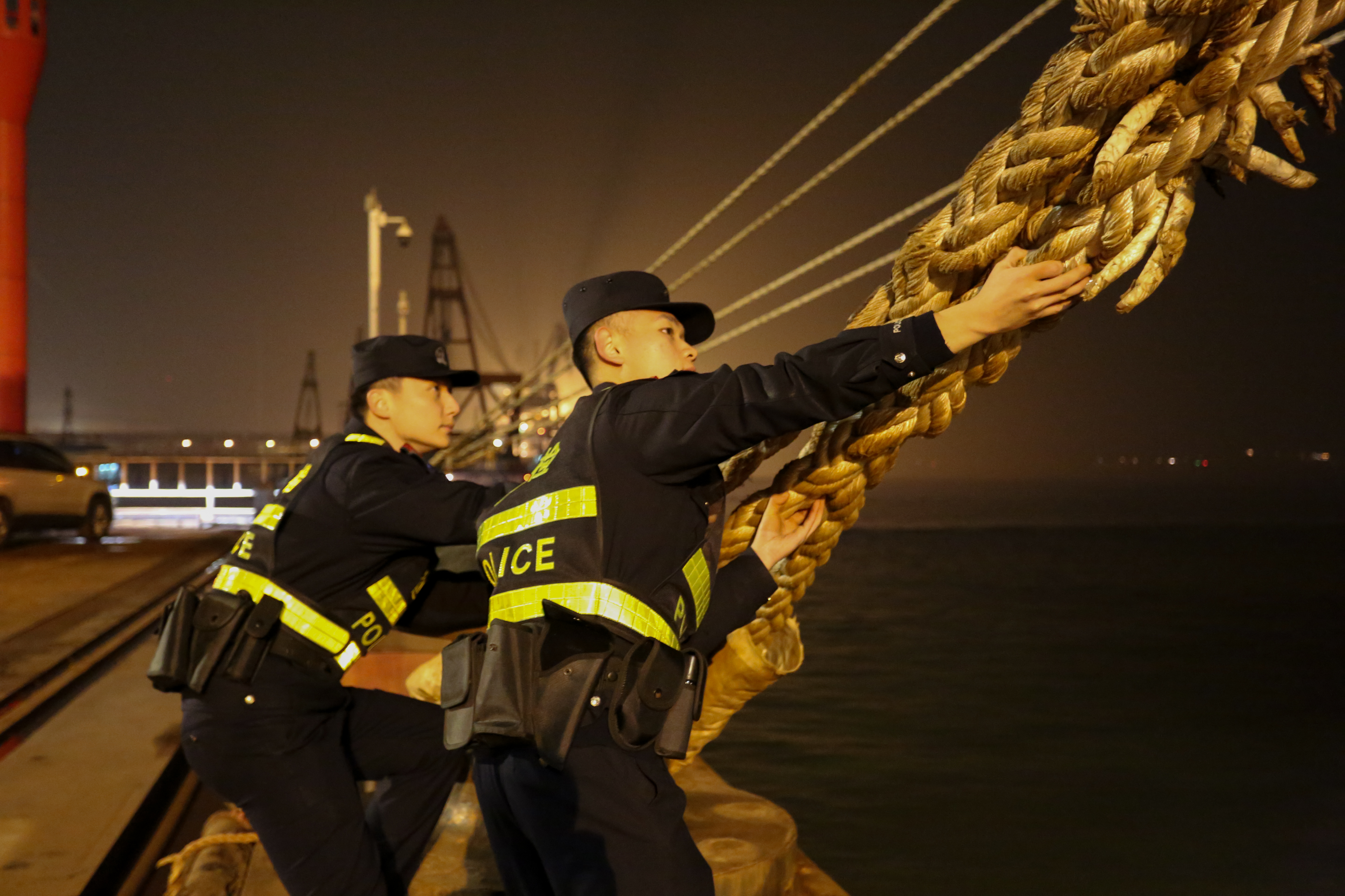 图为1月19日晚,执勤民警正在检查外轮缆绳绑扎情况。