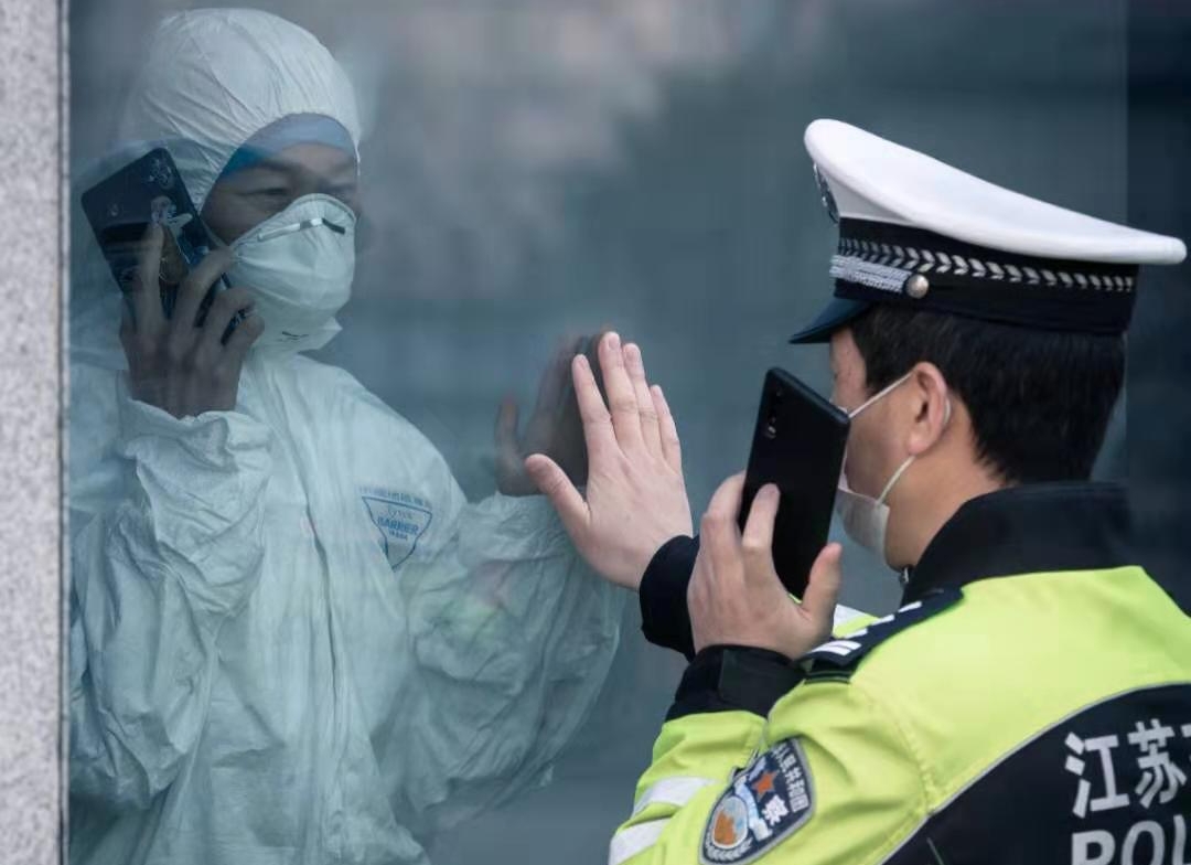 王淑文是徐州医科大学附属医院感染性疾病科一名护士;王生坤是徐州市公安局开发区交警大队民警,两人是同在战“疫“一线医警家庭。自抗疫阻击战开启以来,夫妻俩有十多天没见面了。2月11日,夫妻俩在上班前,在隔离病房大楼内外,隔着玻璃匆匆见了一面,通过电话各自嘱咐对方要注意防护,又匆匆返回属于自己的战场。