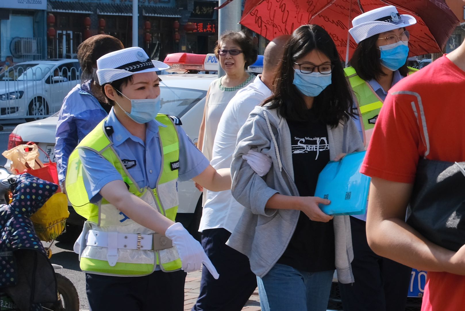 全国高考首日,天津市公安局交管局河北支队全力以赴,增派警力,提前上岗疏导交通,确保考生安全。图为7月7日上午,天津市五十七中考点一名女考生在赶入考场的途中,不慎把脚扭伤,交警、辅警见状便主动上前搀扶她步入学校考场。