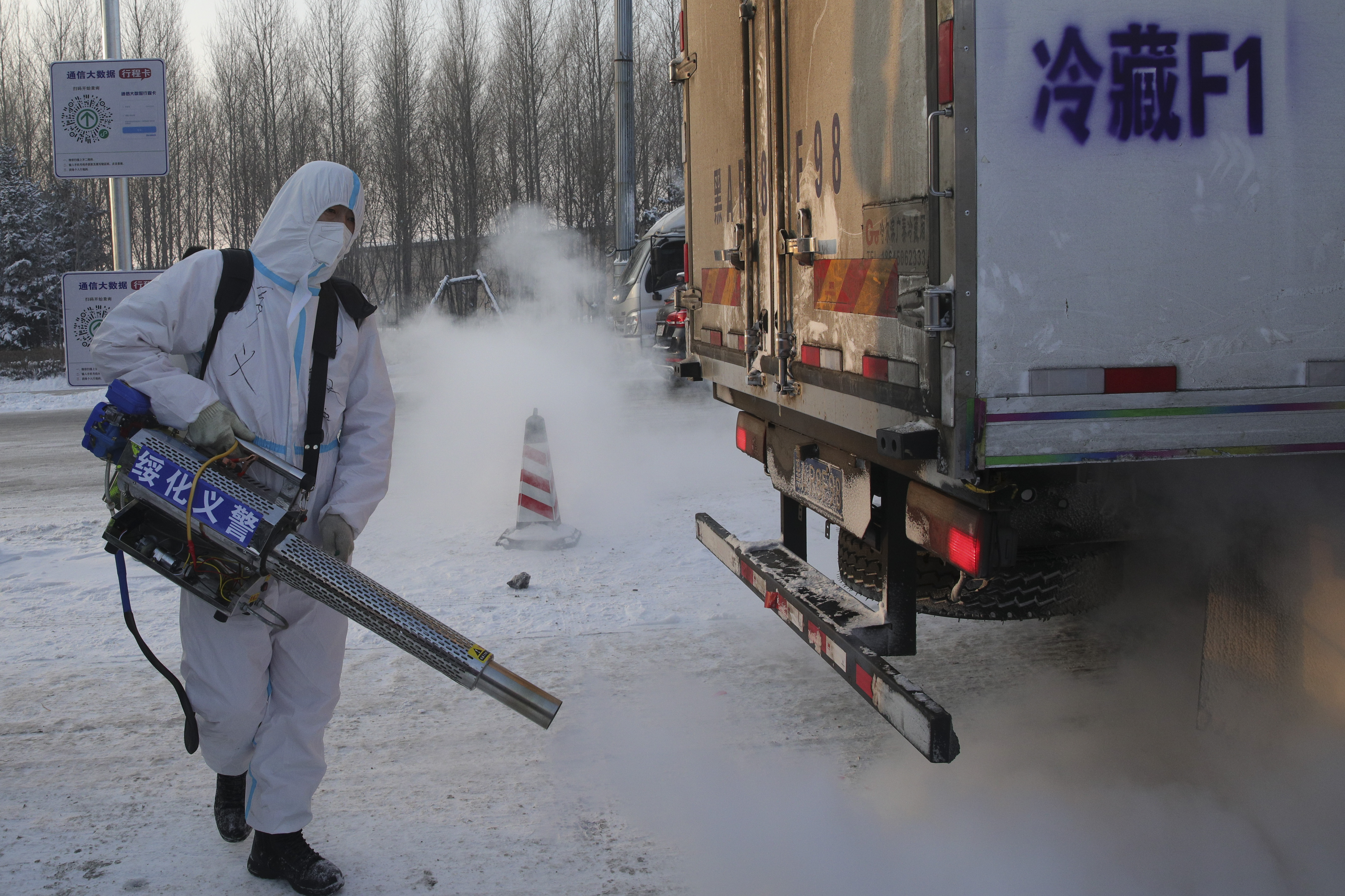 1月14日,绥化应急救援队工作人员在绥化市城南高速口入城处进行消杀作业。