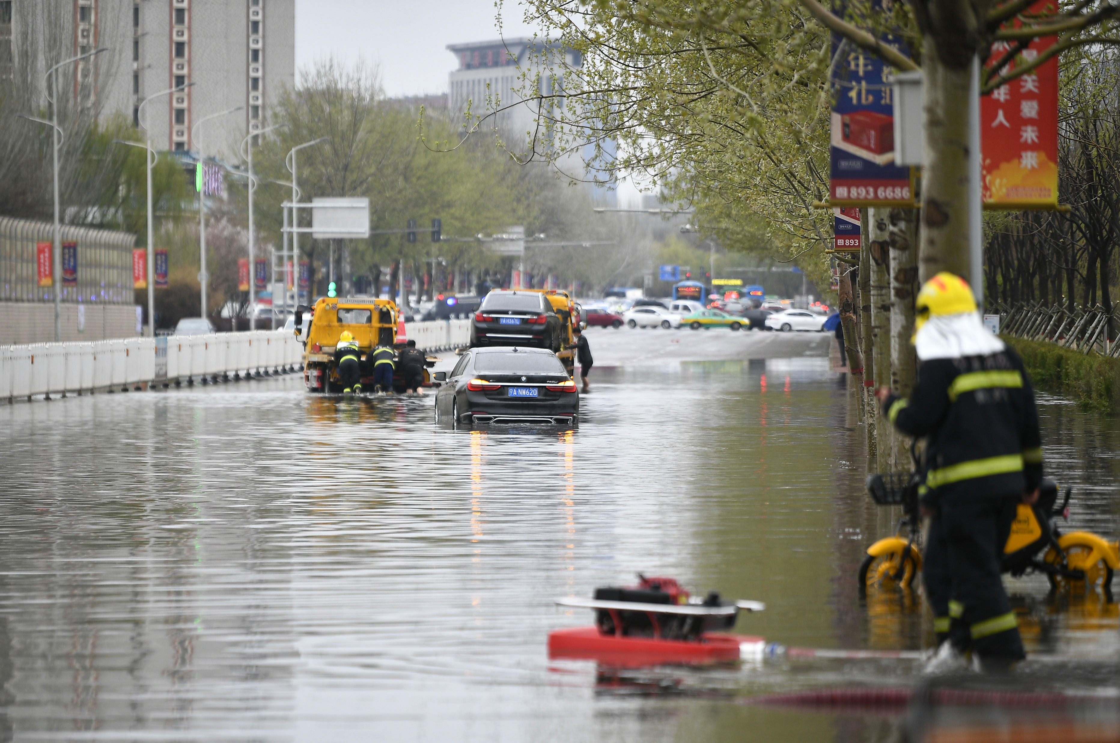 3月30日夜间到31日早晨,宁夏银川市普降中雨。降雨过后,银川市兴庆区上海路(北塔湖附近路段)等路段发生内涝,积水最深超过40厘米,给市民出行带来不便。消防、市政部门按照防汛应急预案,封闭交通、架泵抽排,全力消除路面积水。