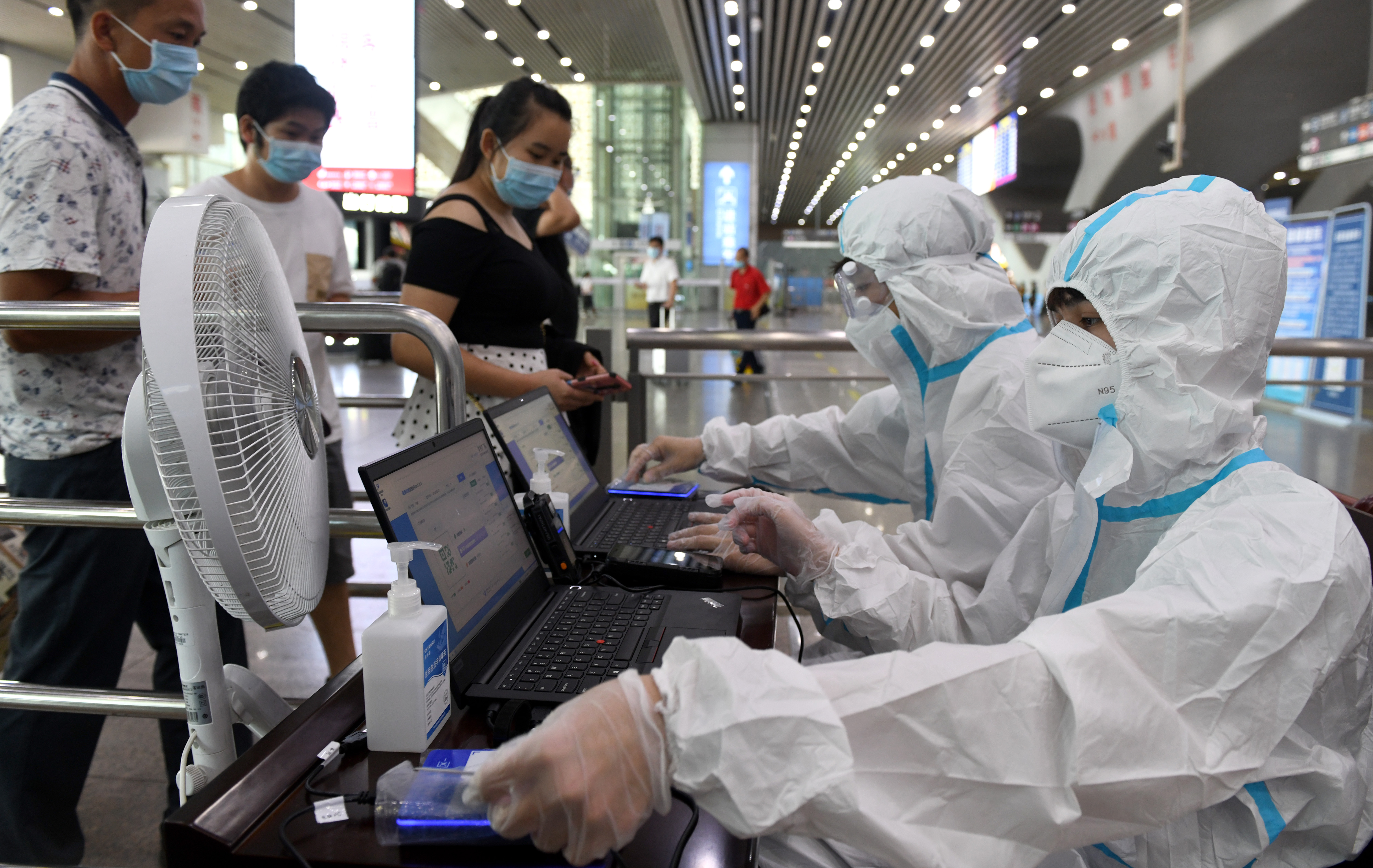 6月16日,广州南站的工作人员通过刷旅客身份证识别旅客健康码状态。