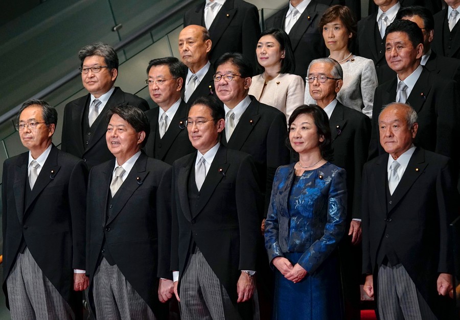 11月10日,日本首相岸田文雄(前排中)在东京的首相官邸率阁僚合影。