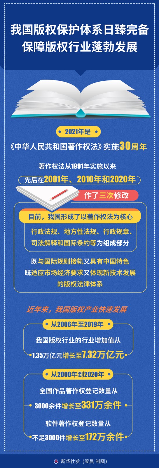 2021年是《中华人民共和国著作权法》实施30周年,记者从10月16日在杭州开幕的第八届中国国际版权博览会上获悉,30年来我国版权保护体系日臻完备,保障版权行业蓬勃发展。