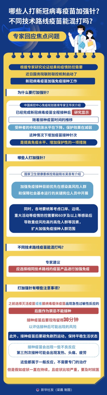 根据专家研究论证结果和疫情防控需要,近日国务院联防联控机制启动了新冠病毒疫苗加强免疫接种工作。哪些人打新冠病毒疫苗加强针?不同技术路线疫苗能混打吗?打加强针有哪些注意事项?国务院联防联控机制有关专家对焦点问题进行回应。