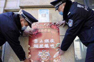 12月28日,天津市公安局治安管理总队会同红桥分局在红桥区三条石街社区开展了以“禁放烟花爆竹 共建美丽天津”为主题的烟花爆竹禁放宣传活动。 图为民警在红桥区三条石街社区张贴宣传海报。 法治日报通讯员 杨娃娃 摄