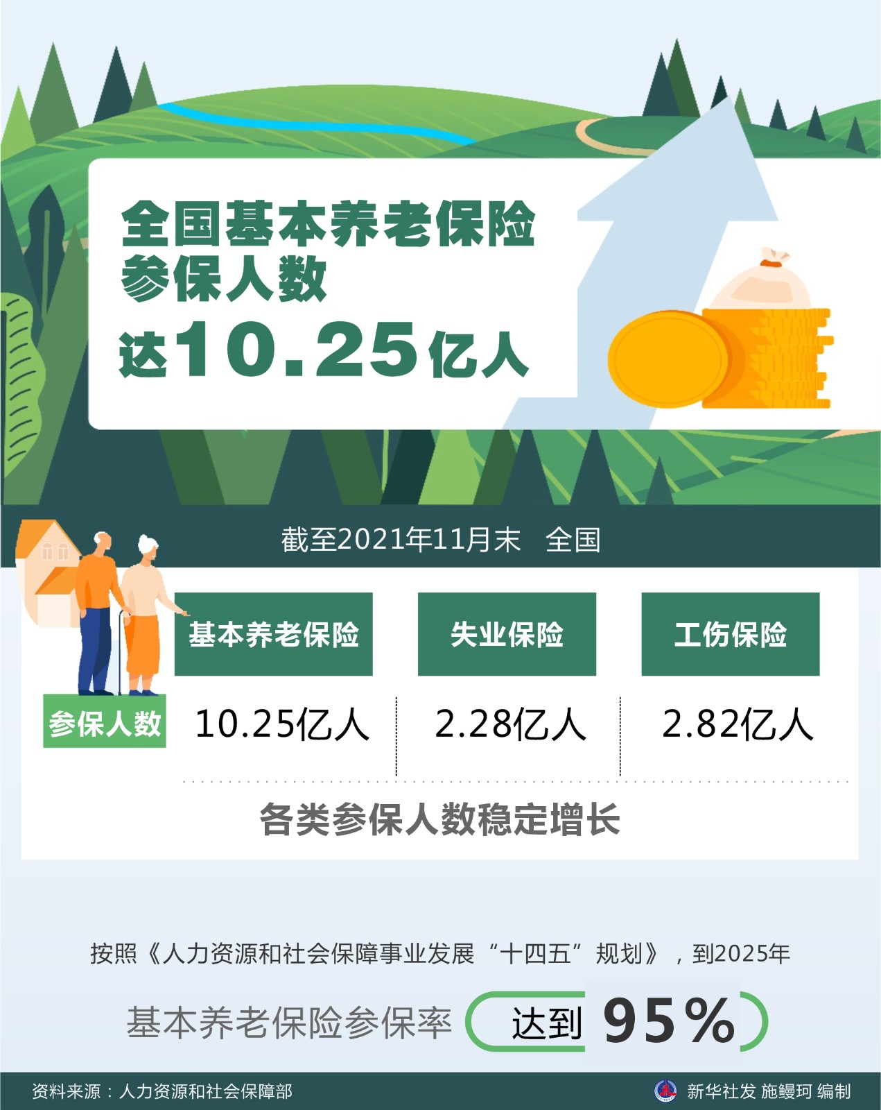 记者近日从人力资源和社会保障部获悉,截至2021年11月末,全国基本养老保险、失业保险、工伤保险参保人数分别为10.25亿人、2.28亿人、2.82亿人,各类参保人数稳定增长。