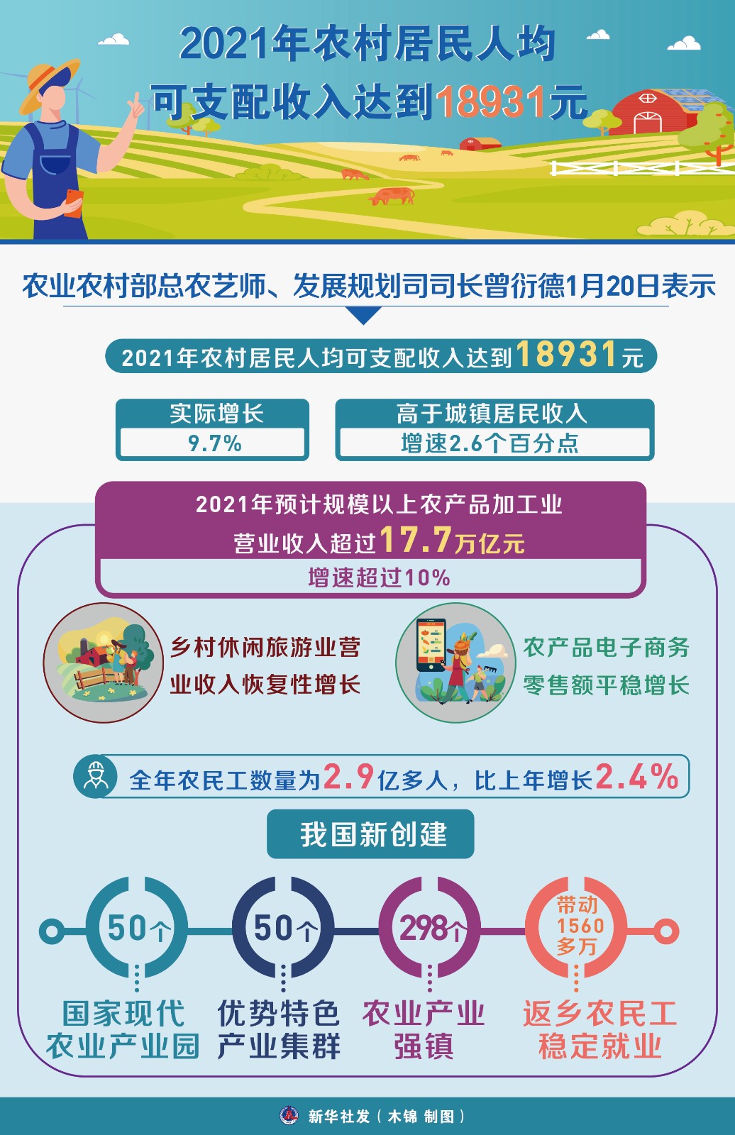 农业农村部总农艺师、发展规划司司长曾衍德1月20日表示,2021年农村居民人均可支配收入达到18931元,实际增长9.7%,高于城镇居民收入增速2.6个百分点。