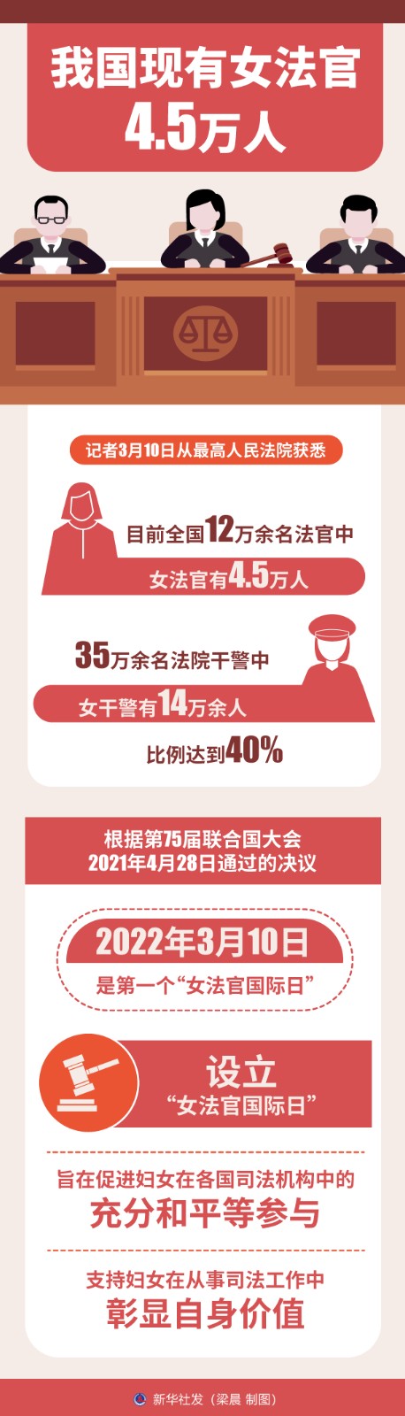 记者3月10日从最高人民法院获悉,目前全国12万余名法官中,女法官有4.5万人。35万余名法院干警中,女干警有14万余人,比例达到40%。