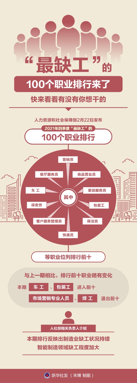 人力资源和社会保障部2月22日发布2021年四季度“最缺工”的100个职业排行,其中,营销员、餐厅服务员、商品营业员、车工、家政服务员、保安员、包装工、客户服务管理员、保洁员、快递员等职业位列排行前十。