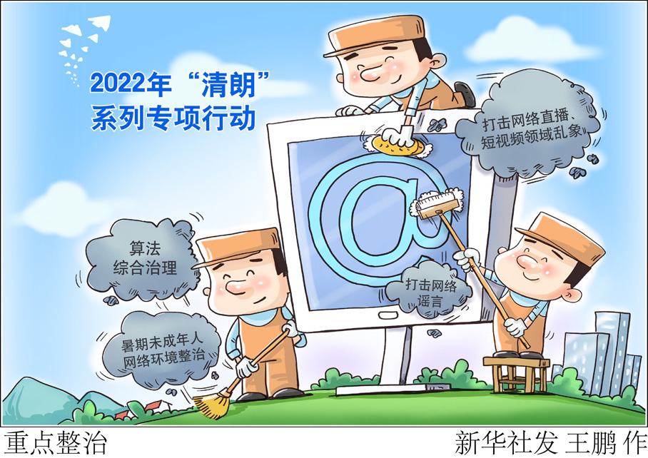 记者3月17日从国新办举行的新闻发布会获悉,2022年“清朗”系列专项行动将重点开展打击网络谣言,打击网络直播、短视频领域乱象,算法综合治理,暑期未成年人网络环境整治等十方面任务。