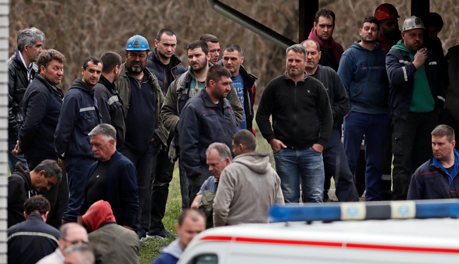 这是4月1日在塞尔维亚索科巴尼亚附近的事故煤矿外拍摄的矿工以及矿工家属。