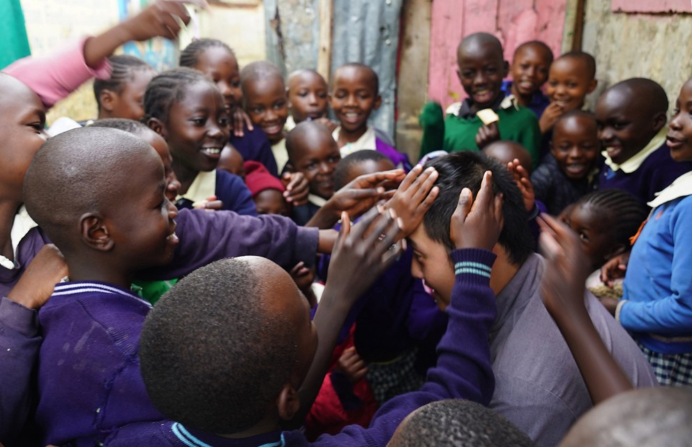 这是4月28日,在肯尼亚内罗毕马萨雷贫民区一所学校,刘宜孟翰与孩子们在一起。