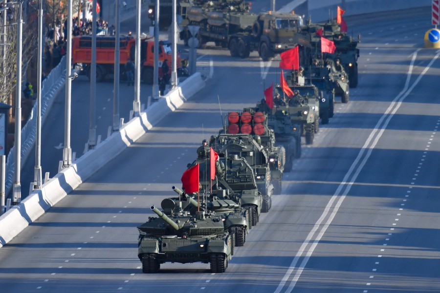 5月4日,在俄罗斯首都莫斯科,参加阅兵活动彩排的军用车辆从市区驶过。