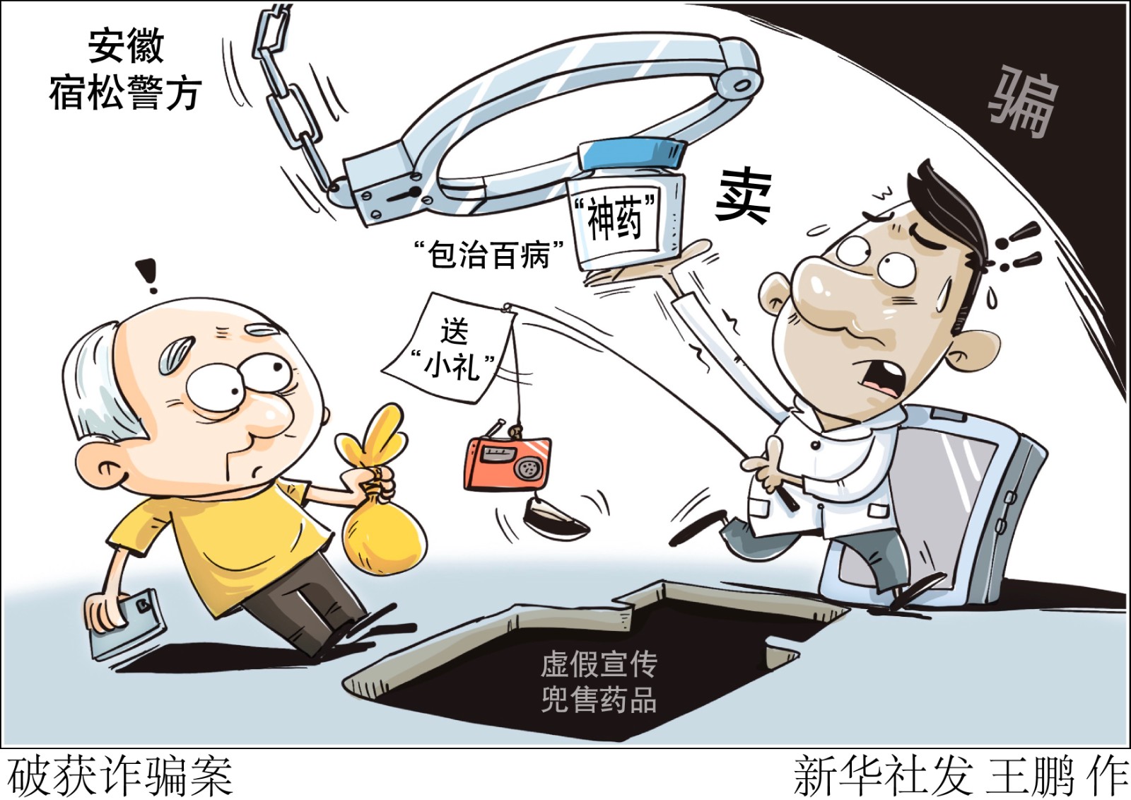 评书机、老人鞋等“小礼”请先笑纳,“包治百病”的“神药”快来试试?小心“骗你没商量”!记者日前从安徽省安庆市宿松县公安局了解到,当地警方打掉一个向中老年群体虚假宣传兜售药品进行诈骗的犯罪团伙,全国多地数千人上当,涉案金额近千万元。