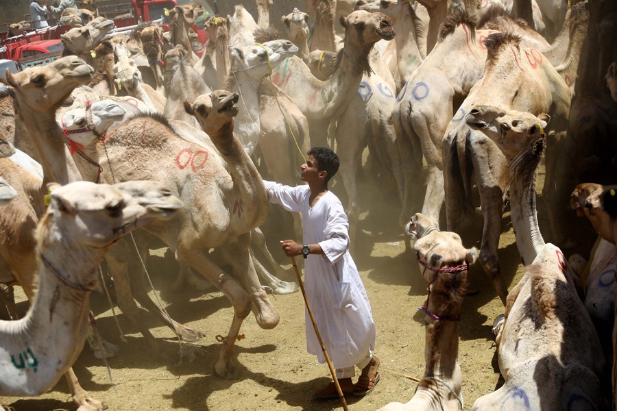 6月10日,商贩在埃及开罗附近的一处骆驼市场等待顾客。