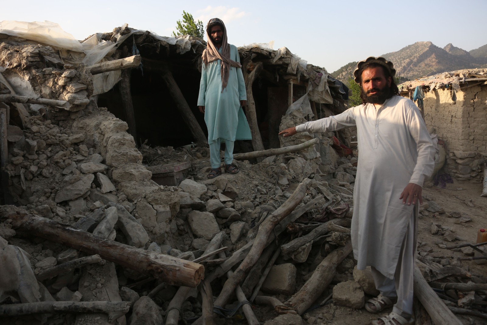 6月26日,在阿富汗霍斯特省,人们站在废墟之中。