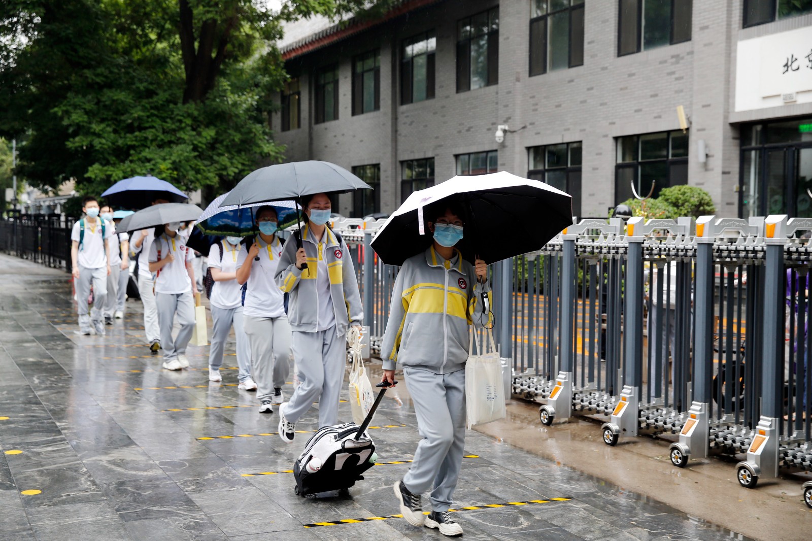6月27日,北京二中学生在出示健康码、接受体温检测后按照指定通道进入校园。