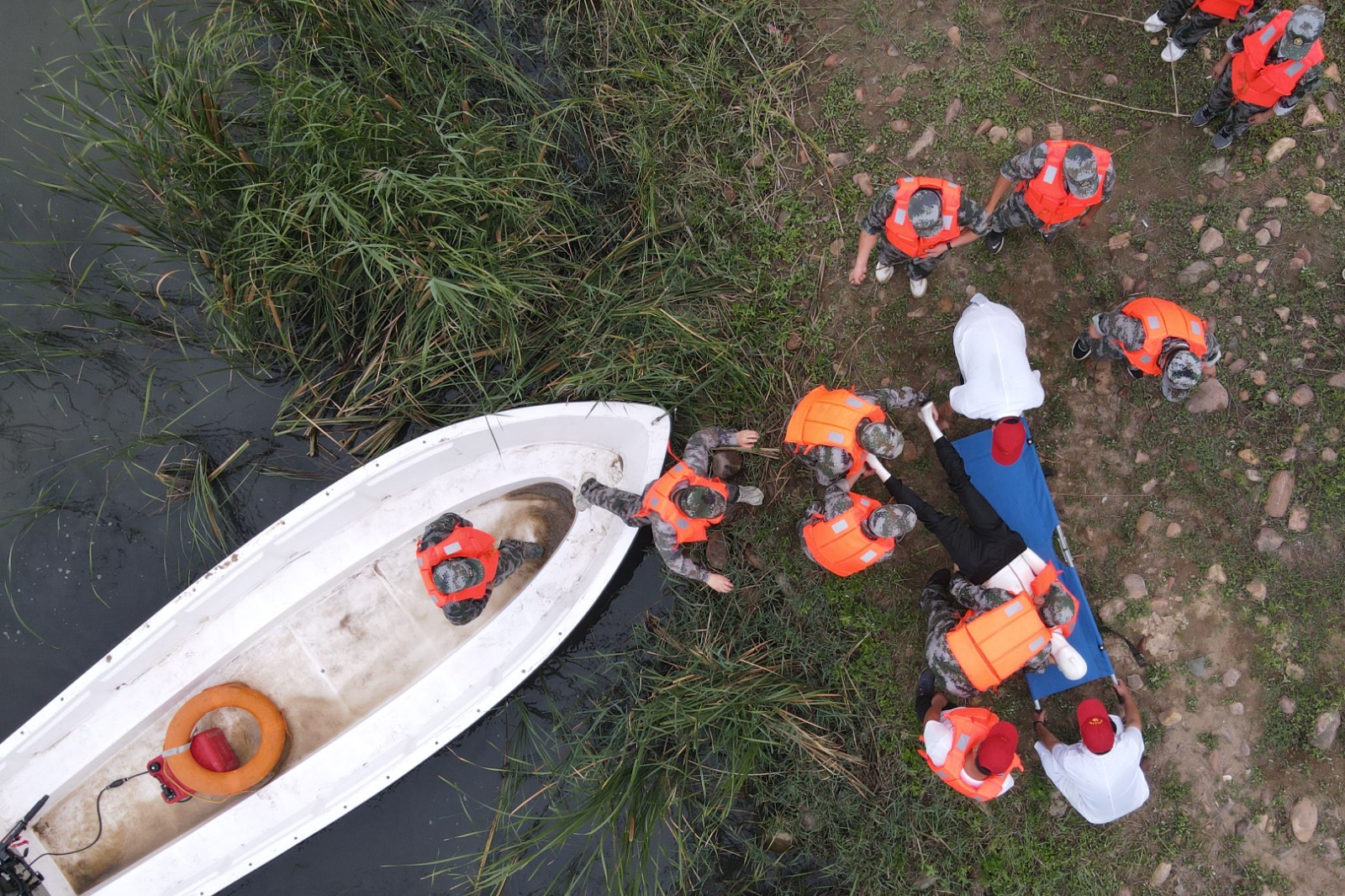 7月5日,在河北省沙河市十里亭镇下解村举行的防汛演练中,参演人员在演练营救“落水群众”(无人机照片)。