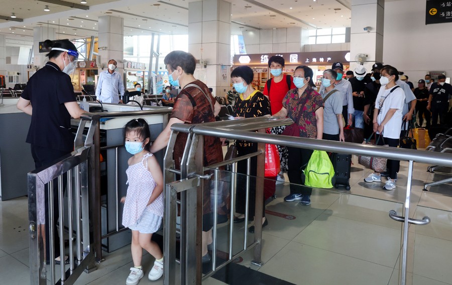 7月5日,在上海长途客运南站,旅客在检票口检票乘车。