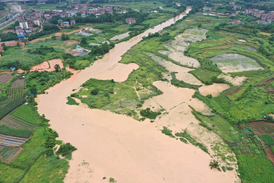 这是7月4日拍摄的广西南宁市那平江水位上涨情况(无人机照片)。