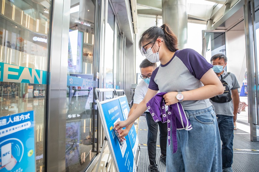 7月4日,在重庆两江新区一购物公园内,顾客使用NFC功能完成入场登记。