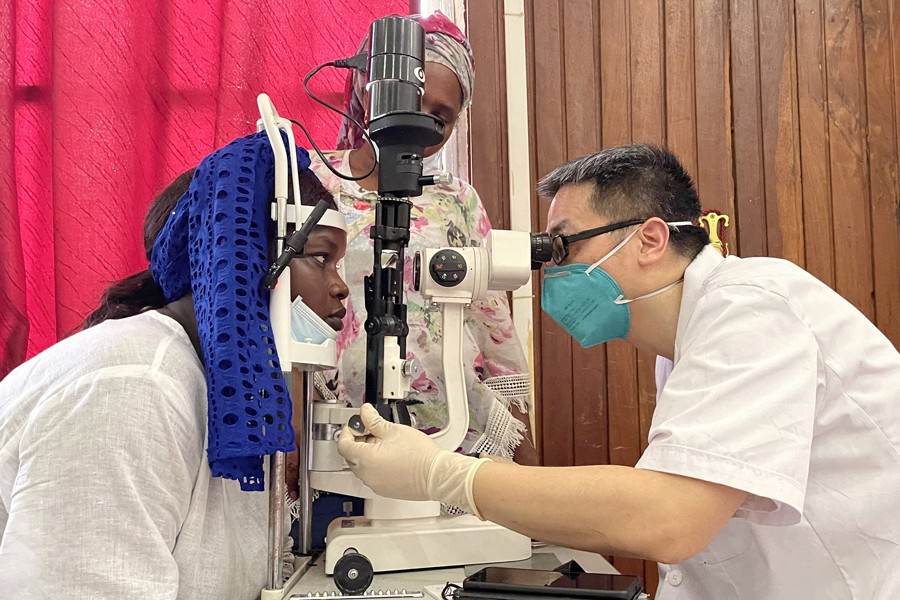 6月23日,在塞内加尔坦巴昆达大区议会大楼会议厅,中国医生为病人进行诊疗。