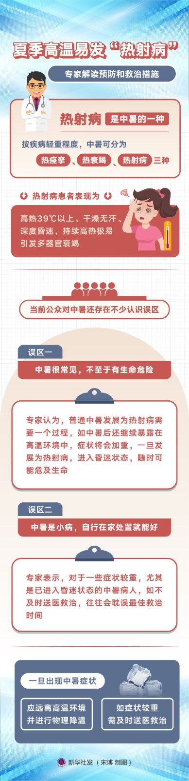 连日来,南方多地持续高温。热浪来袭,多地已有多人确诊热射病。专家介绍,随着生产生活条件改善和公众防范意识增强,其实近年来医院接诊热射病人数不断减少,但仍需警惕极端高温条件下热射病患者增多,以及普通中暑患者因处理不当而发展成热射病病人的情况。