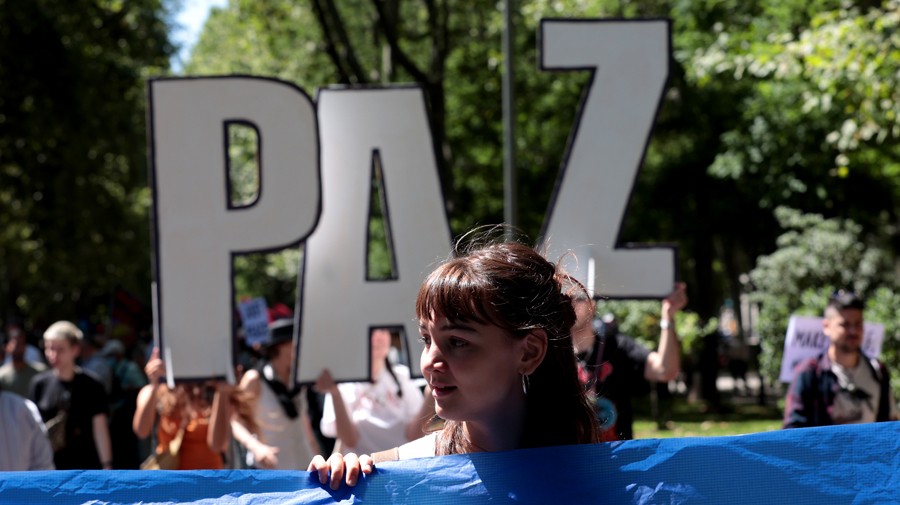 数千人26日在西班牙首都马德里市中心参加反对北约、呼吁世界和平大游行。