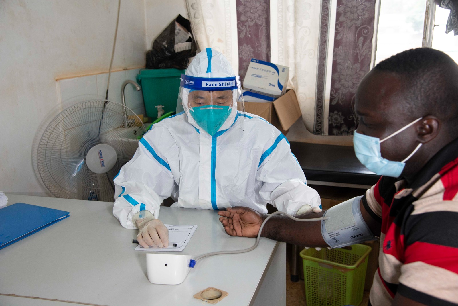6月9日,在中非共和国首都班吉,中国医疗队医生为病人测血压。