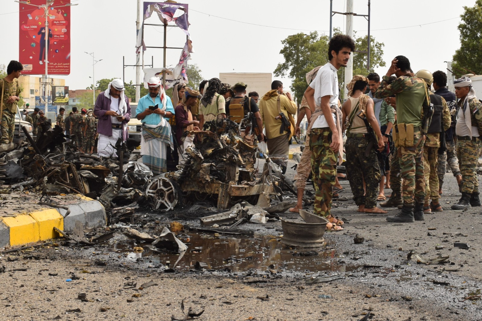 6月29日,安全人员聚集在也门亚丁的汽车炸弹袭击现场。