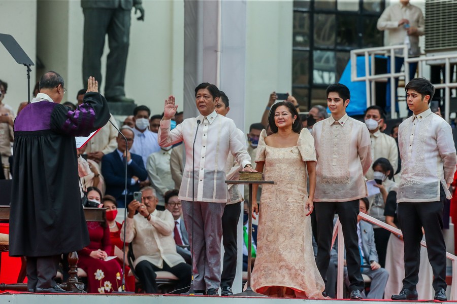 6月30日,费迪南德·罗慕尔德兹·马科斯(中左)在菲律宾首都马尼拉举行的总统就职典礼上宣誓。