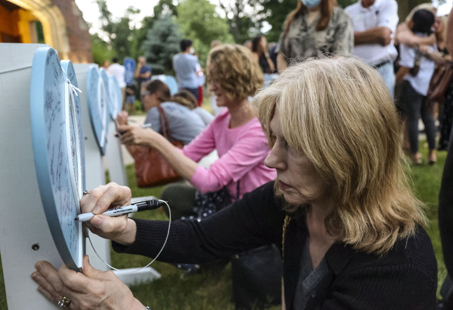 7月5日,在美国伊利诺伊州海兰帕克市,人们书写留言悼念“独立日”枪击案遇难者。