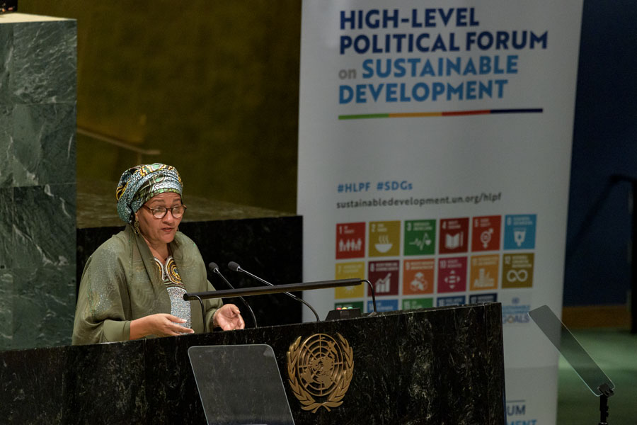 7月5日,在位于纽约的联合国总部,联合国常务副秘书长阿明娜·穆罕默德在联合国可持续发展高级别政治论坛上发言。
