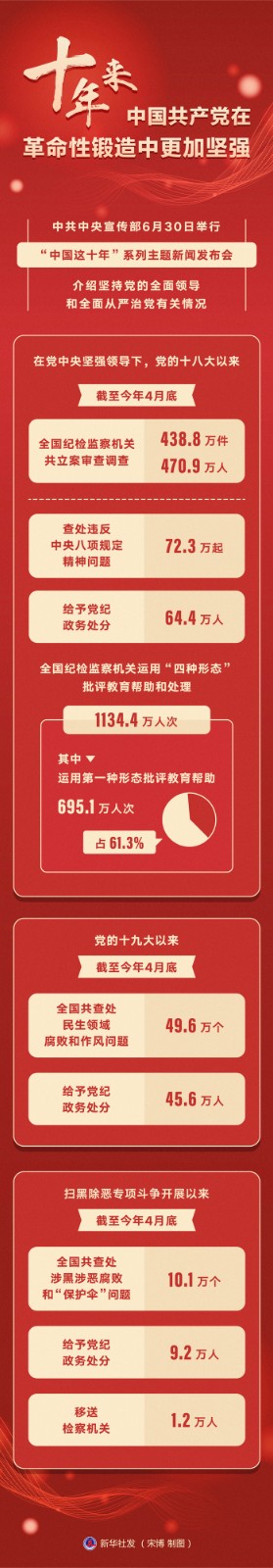 中共中央宣传部6月30日举行“中国这十年”系列主题新闻发布会,介绍坚持党的全面领导和全面从严治党有关情况。中央纪委国家监委宣传部部长王建新表示,十年浴火淬炼,全面从严治党政治引领和政治保障作用充分发挥,管党治党宽松软状况得到根本扭转,我们党在革命性锻造中更加坚强。