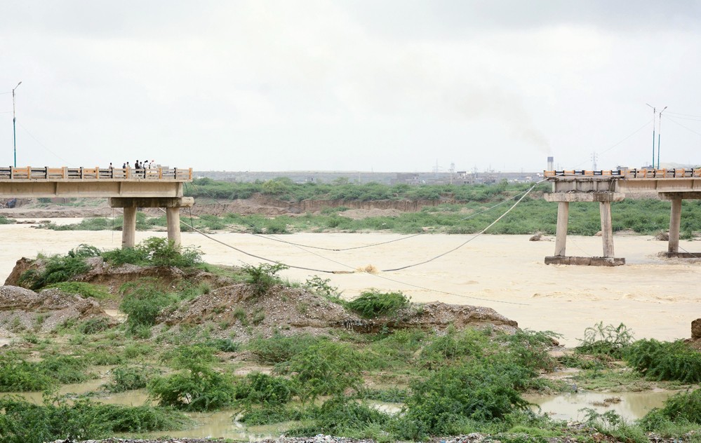 这是7月26日在巴基斯坦卡拉奇拍摄的在洪水中损毁的桥梁。
