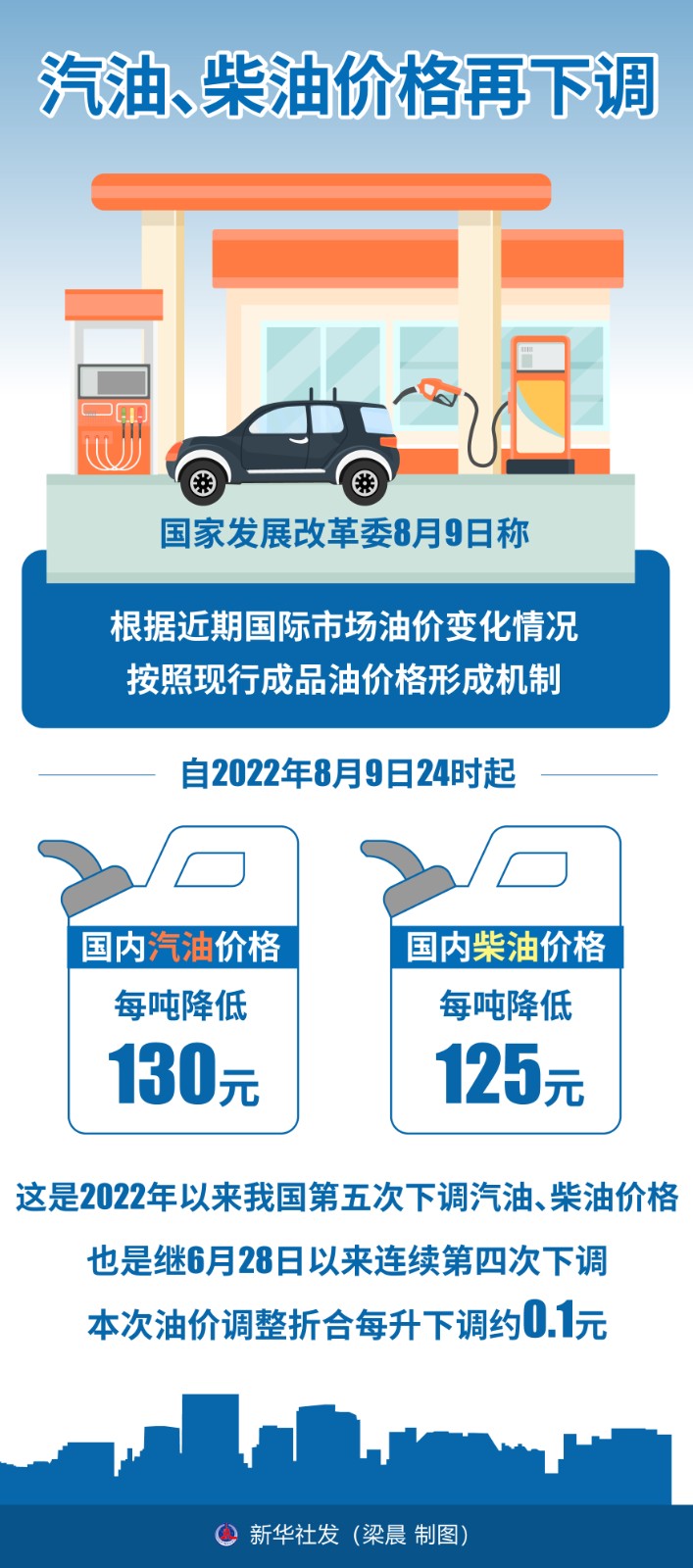 国家发展改革委8月9日称,根据近期国际市场油价变化情况,按照现行成品油价格形成机制,自2022年8月9日24时起,国内汽油、柴油价格每吨分别降低130元和125元。