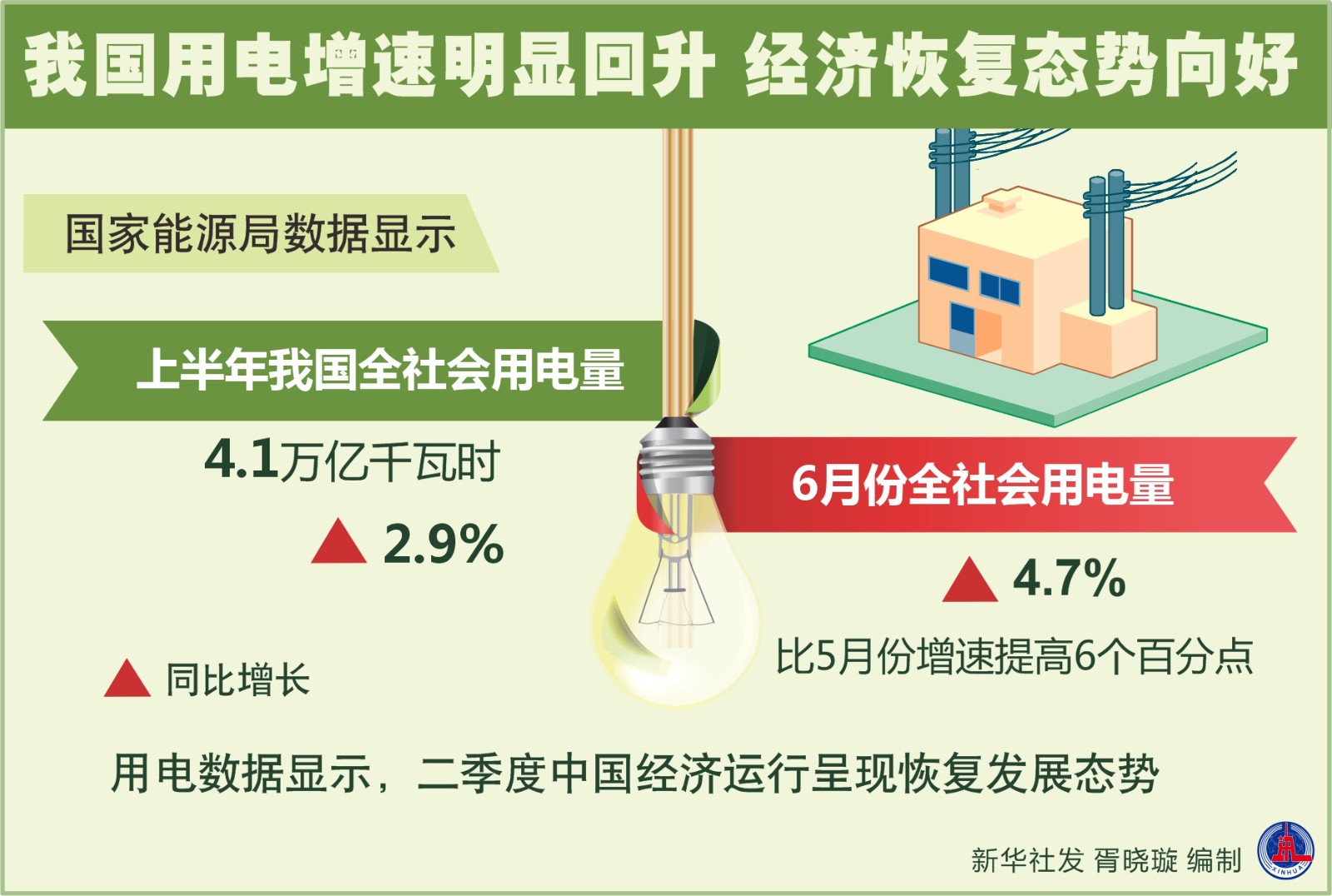 国家能源局数据显示,上半年我国全社会用电量4.1万亿千瓦时,同比增长2.9%。6月份全社会用电量同比增长4.7%,比5月份增速提高6个百分点。用电数据显示,二季度中国经济运行呈现恢复发展态势。