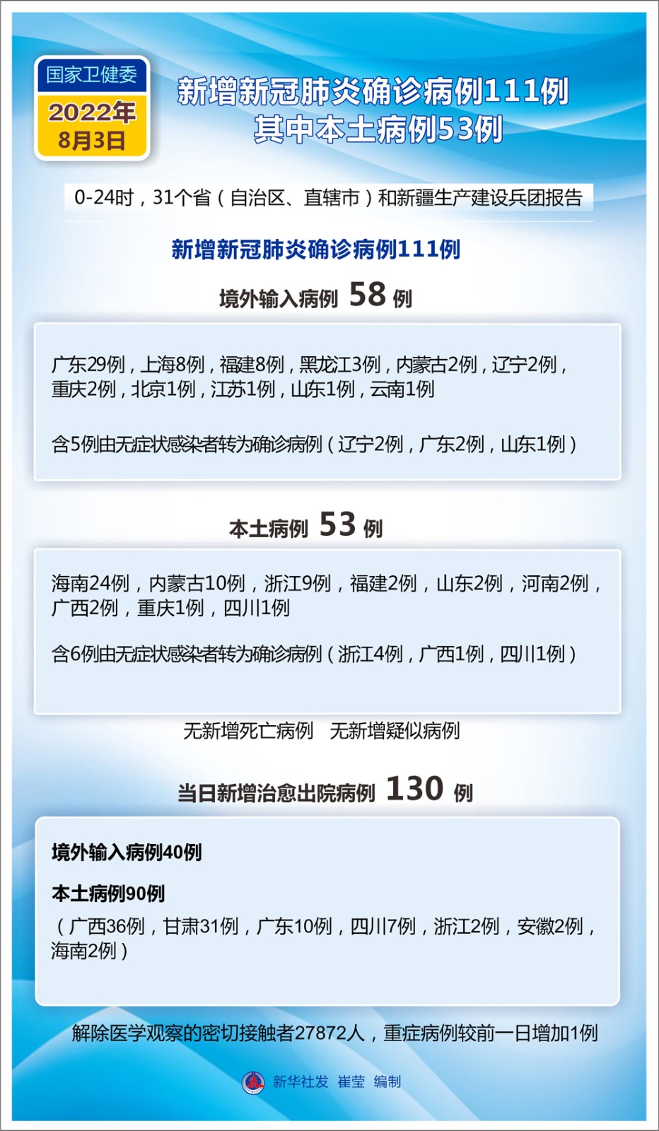 (图表)国家卫健委:8月3日新增新冠肺炎确诊病例111例 其中本土病例53例