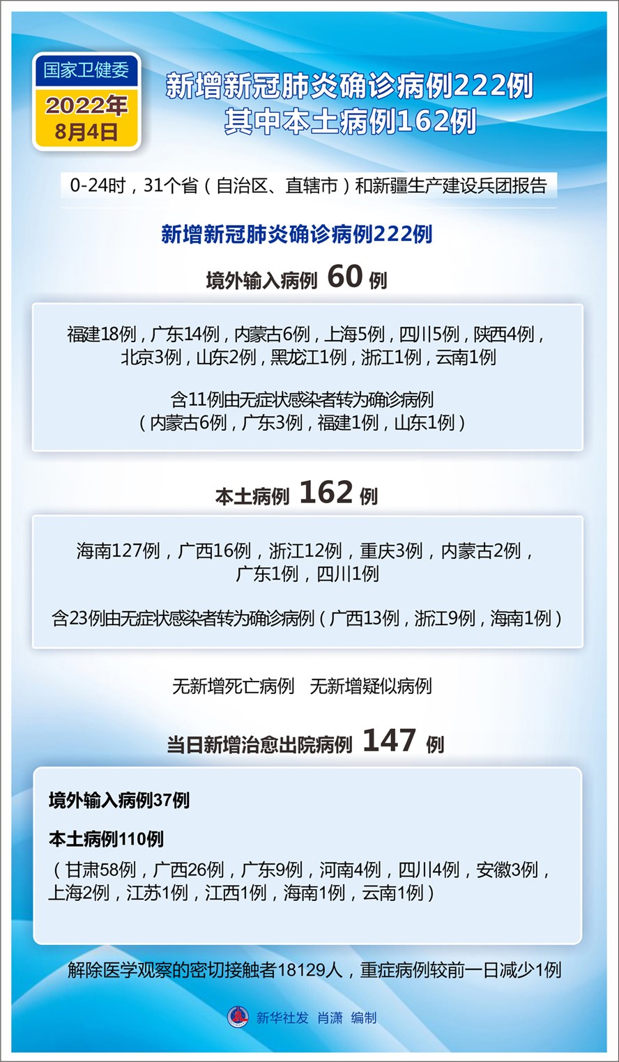 (图表)国家卫健委:8月4日新增新冠肺炎确诊病例222例 其中本土病例162例