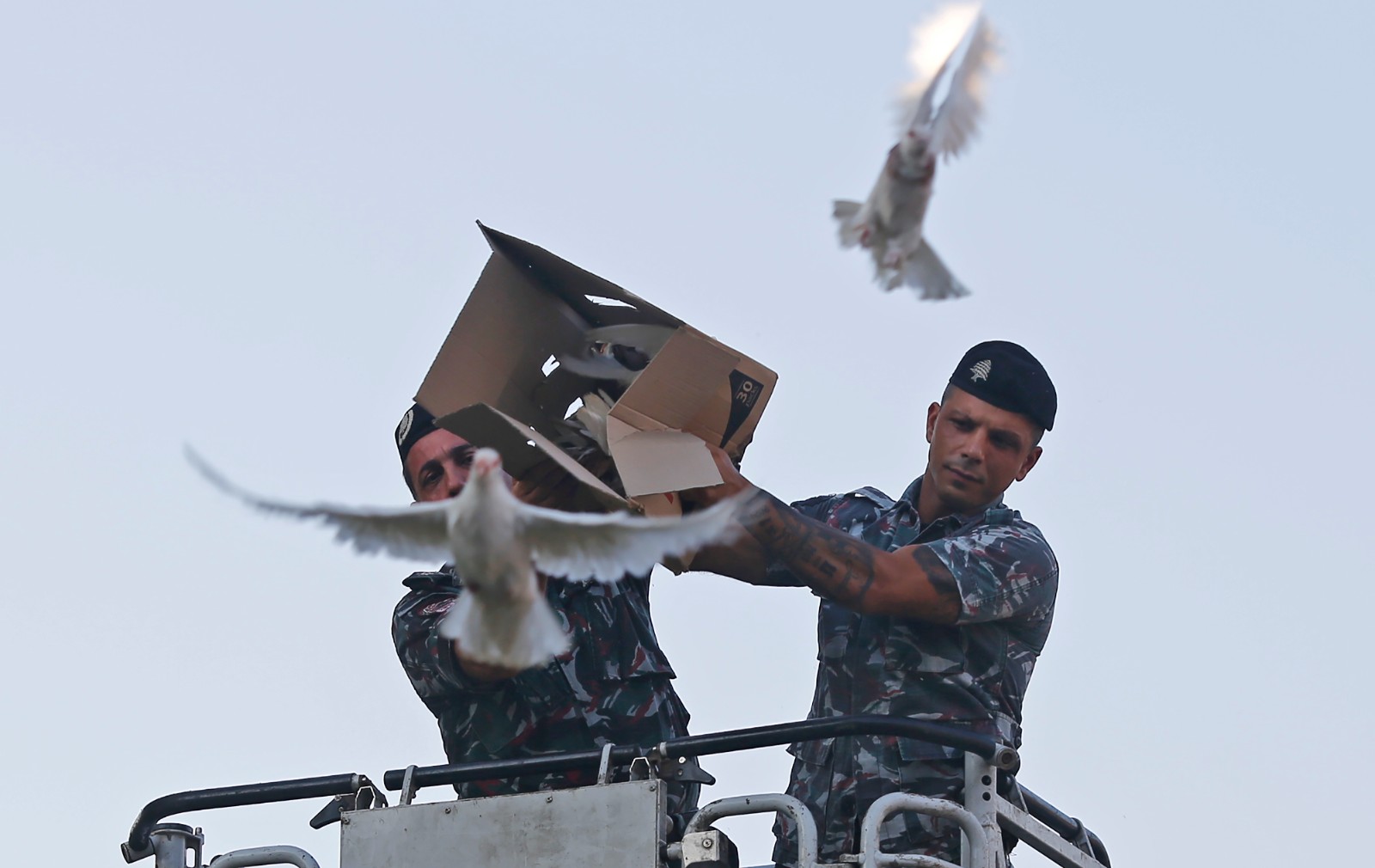 8月3日,在黎巴嫩贝鲁特,人们放飞白鸽,纪念贝鲁特港口大爆炸中牺牲的消防人员。