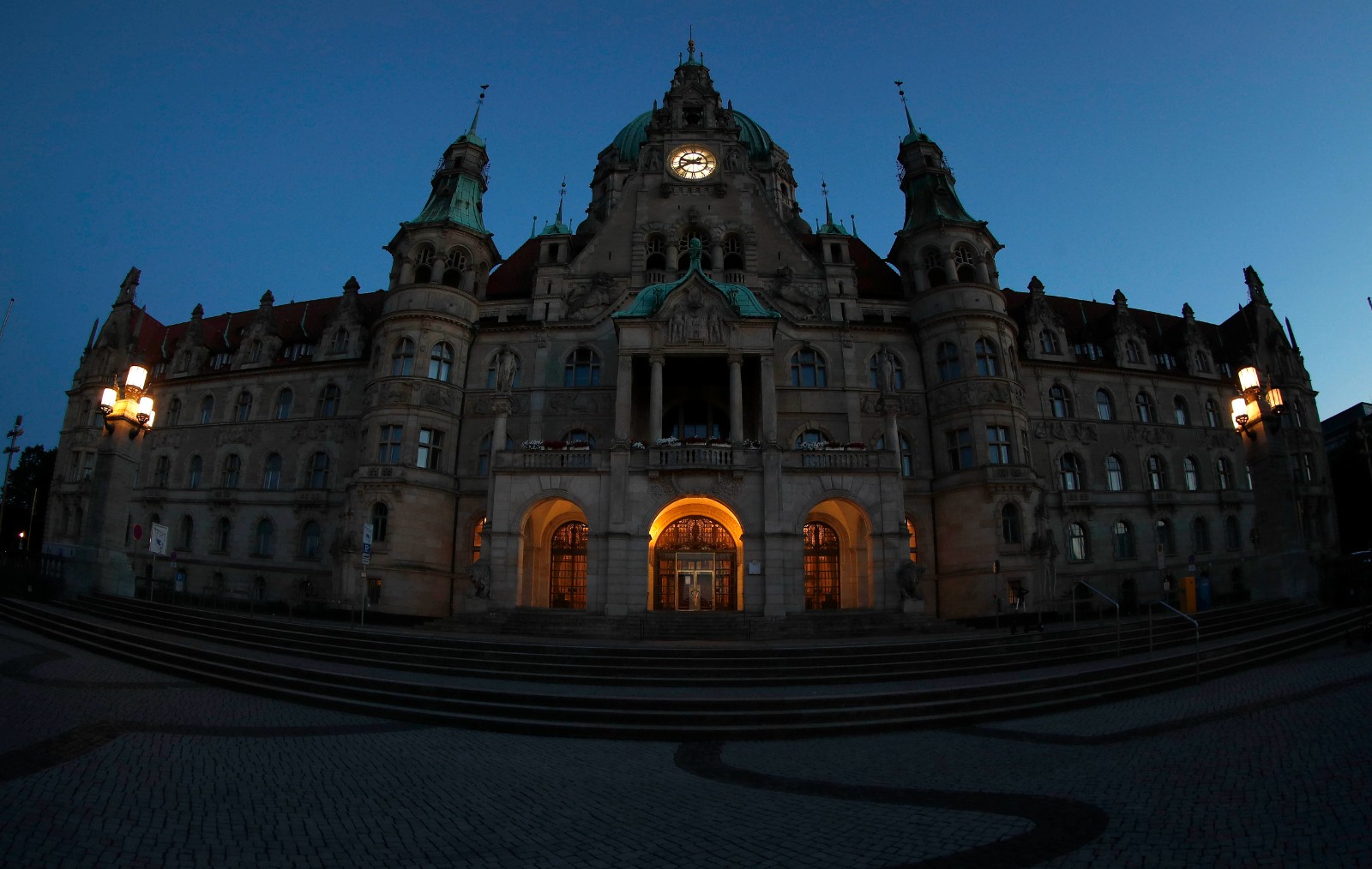 这是8月1日晚拍摄的德国汉诺威市政厅。