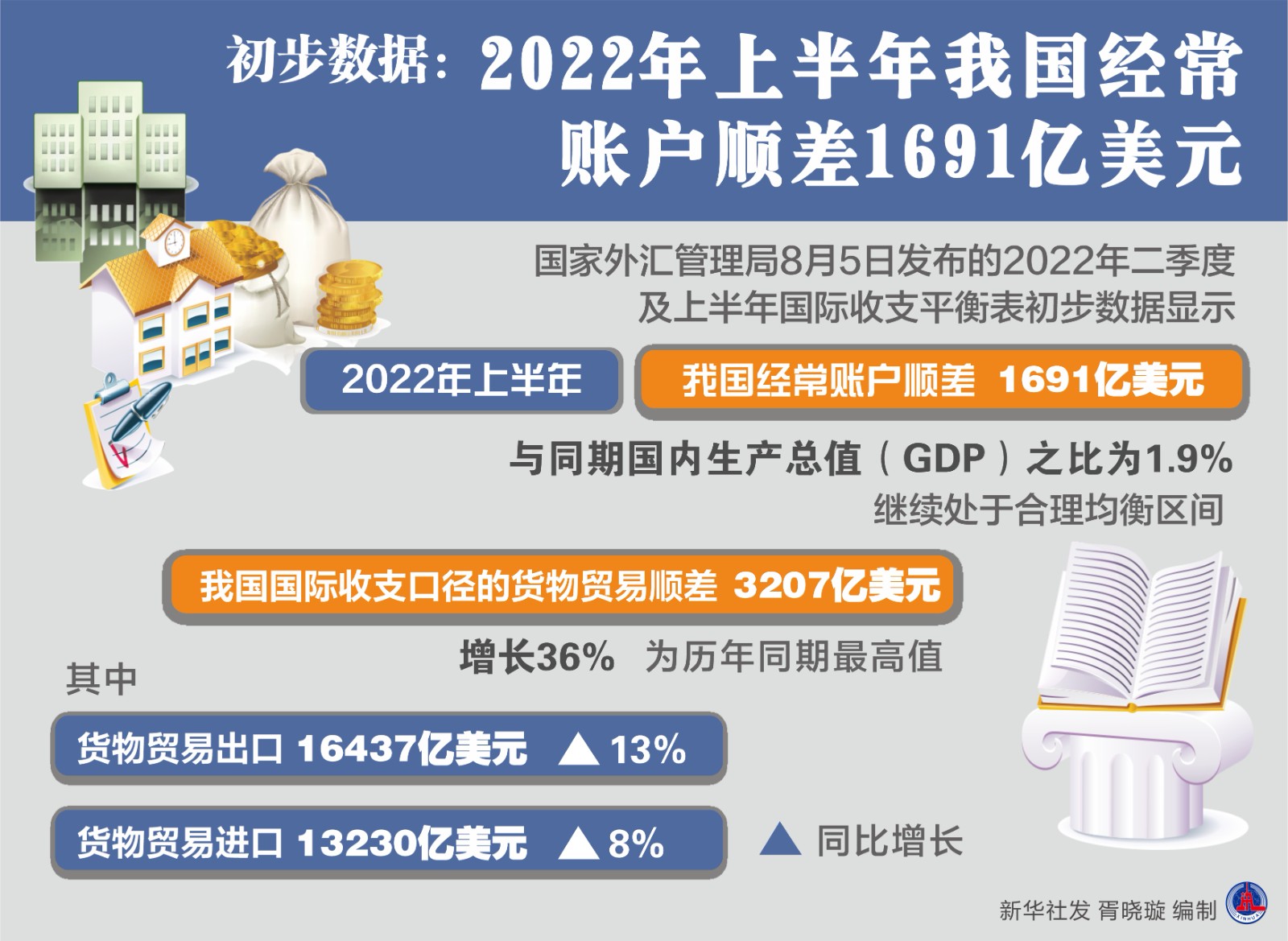 国家外汇管理局8月5日发布的2022年二季度及上半年国际收支平衡表初步数据显示,2022年上半年,我国经常账户顺差1691亿美元,与同期国内生产总值(GDP)之比为1.9%,继续处于合理均衡区间。