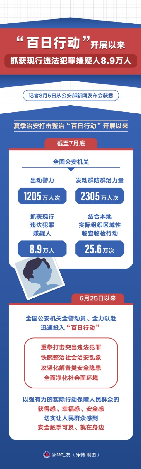 记者8月5日从公安部新闻发布会获悉,夏季治安打击整治“百日行动”开展以来,截至7月底,全国公安机关出动警力1205万人次,发动群防群治力量2305万人次,抓获现行违法犯罪嫌疑人8.9万人,结合本地实际组织区域性临查临检行动25.6万次。