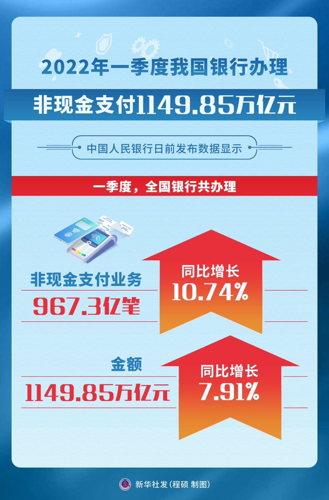 中国人民银行日前发布数据显示,一季度,全国银行共办理非现金支付业务967.3亿笔,金额1149.85万亿元,同比分别增长10.74%和7.91%。