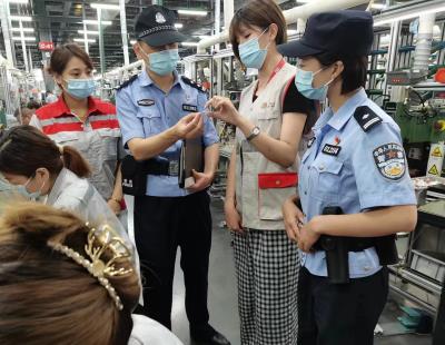 图为8月1日,民警正在走访辖区电气厂。